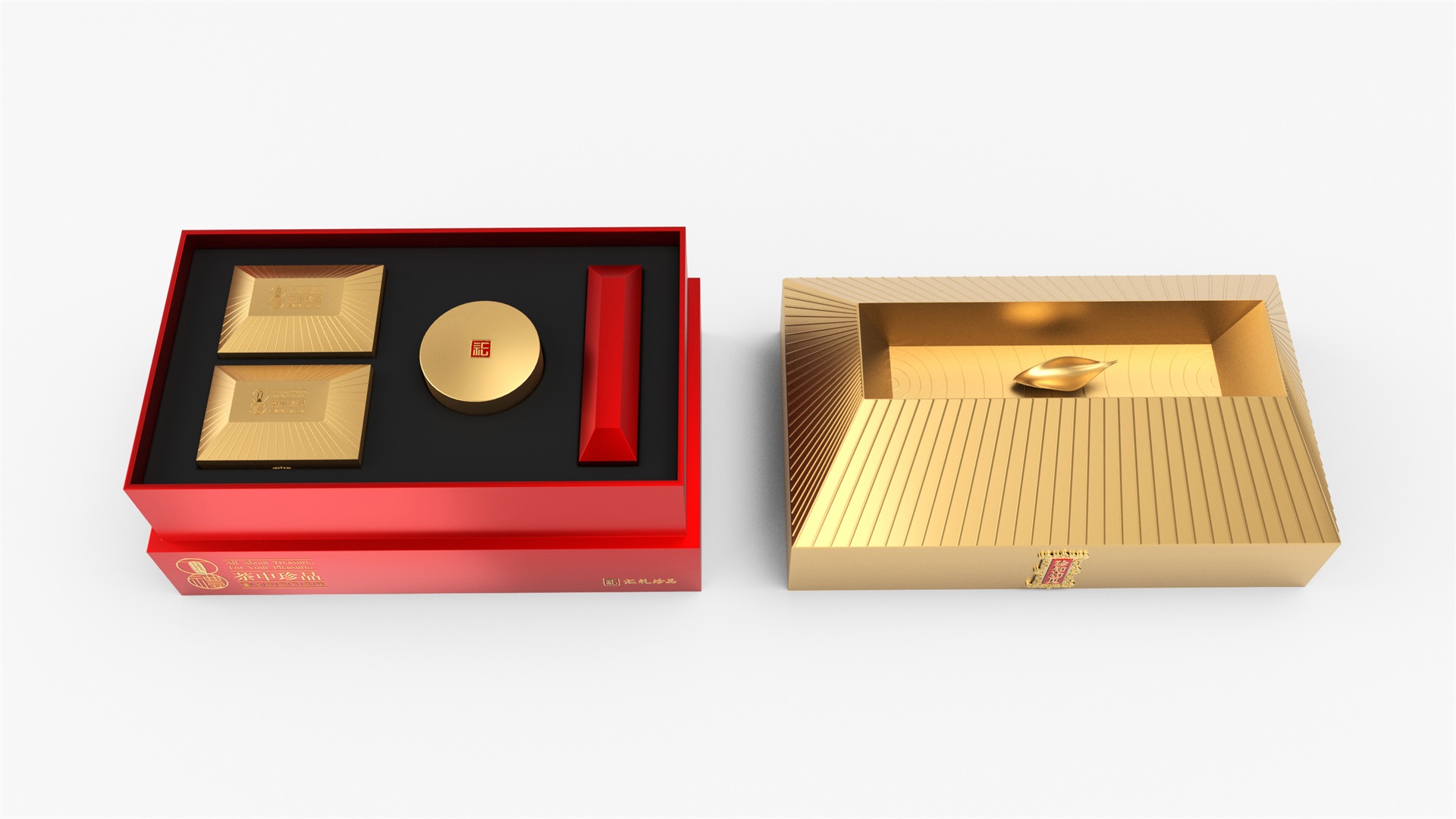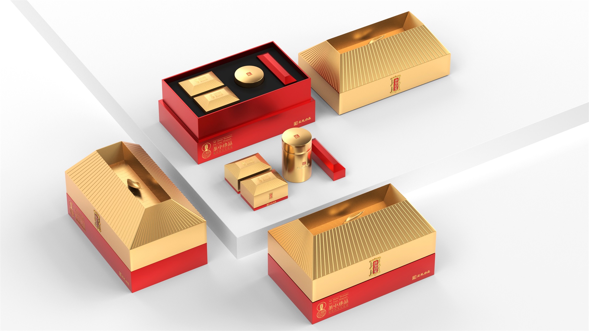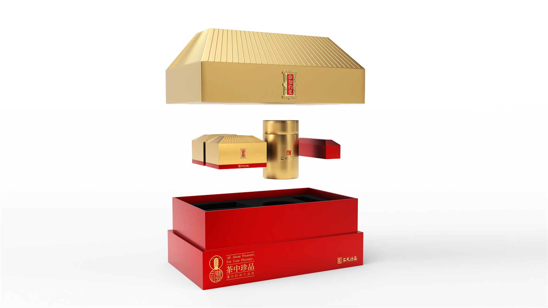 汇礼珍品包装设计,基于产品品级为茶中王者级别,J9九游会所以包装整体造型采用中国古代地位的皇家元素:宫殿为设计灵感进行设计,包装上盖为金色宫殿屋檐造型,斜面上也装饰了代表瓦片的条纹,上盖中部内陷,底部使用水纹铺底,在水纹上飘着一片金色的茶叶,高山流水觅知音,在一个上盖营造出了基于高端气质上,茶道与人道相融的意境画面;在上盖的正面中部,使用宫殿匾额形式作为展示包装的品类名称,将包装的宫殿造型进一步完善。支撑金色宫殿下方的红色地台作为包装下部,在正面放置文字信息和品牌标志。整体采用天地盖的形式,使开盖具备仪式感。内部分包装与外部形式大体相同,但有所以简略,保证整体性的同时也保证整体包装不会过于繁复,保持平衡。