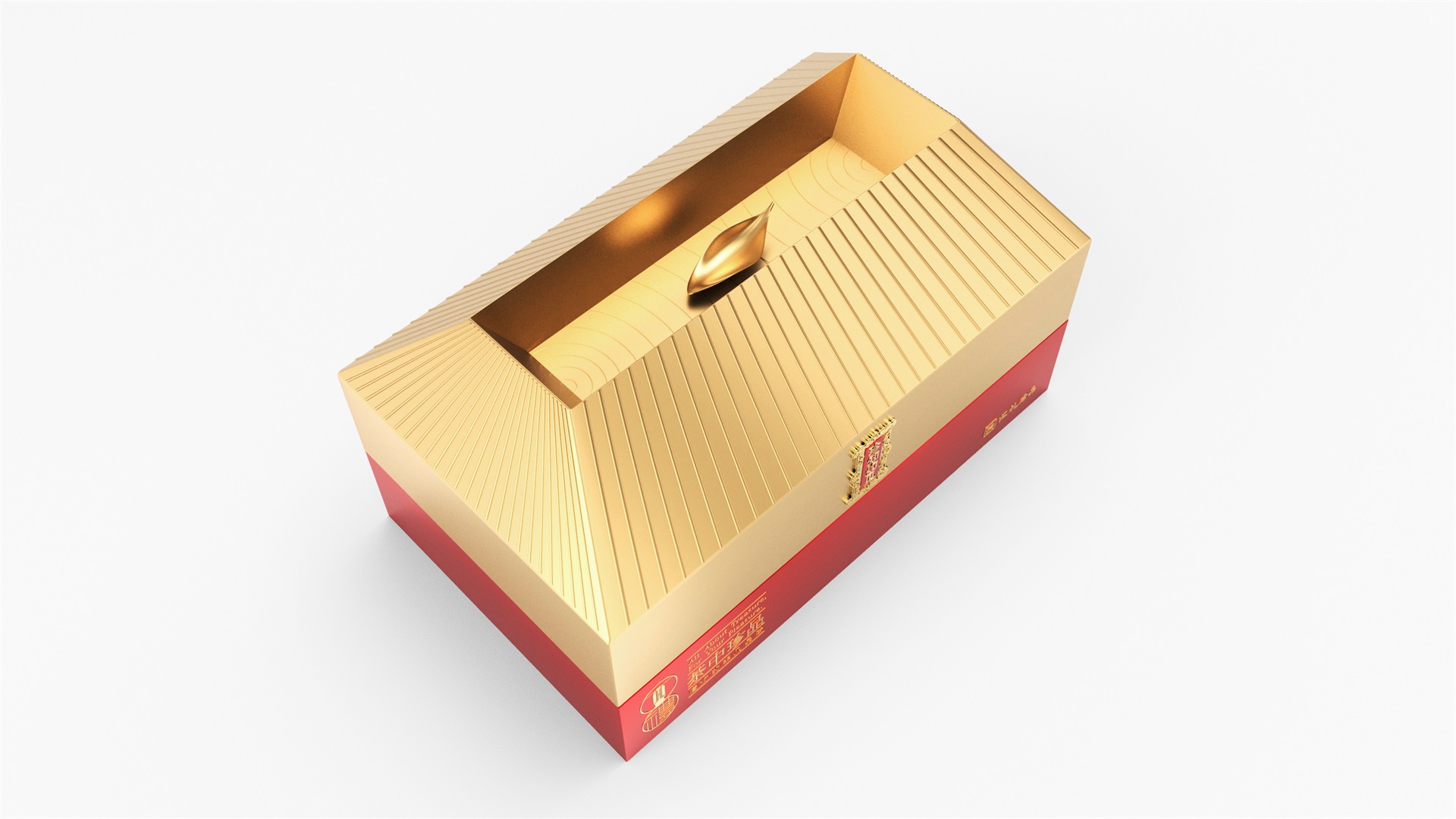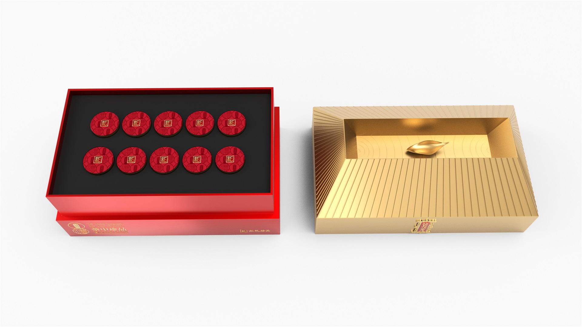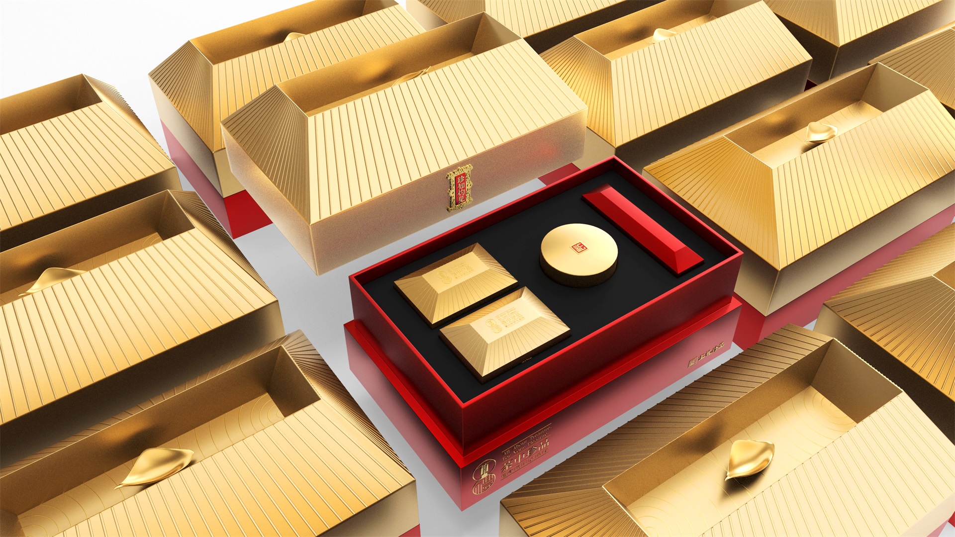 汇礼珍品包装设计,基于产品品级为茶中王者级别,J9九游会所以包装整体造型采用中国古代地位的皇家元素:宫殿为设计灵感进行设计,包装上盖为金色宫殿屋檐造型,斜面上也装饰了代表瓦片的条纹,上盖中部内陷,底部使用水纹铺底,在水纹上飘着一片金色的茶叶,高山流水觅知音,在一个上盖营造出了基于高端气质上,茶道与人道相融的意境画面;在上盖的正面中部,使用宫殿匾额形式作为展示包装的品类名称,将包装的宫殿造型进一步完善。支撑金色宫殿下方的红色地台作为包装下部,在正面放置文字信息和品牌标志。整体采用天地盖的形式,使开盖具备仪式感。内部分包装与外部形式大体相同,但有所以简略,保证整体性的同时也保证整体包装不会过于繁复,保持平衡。